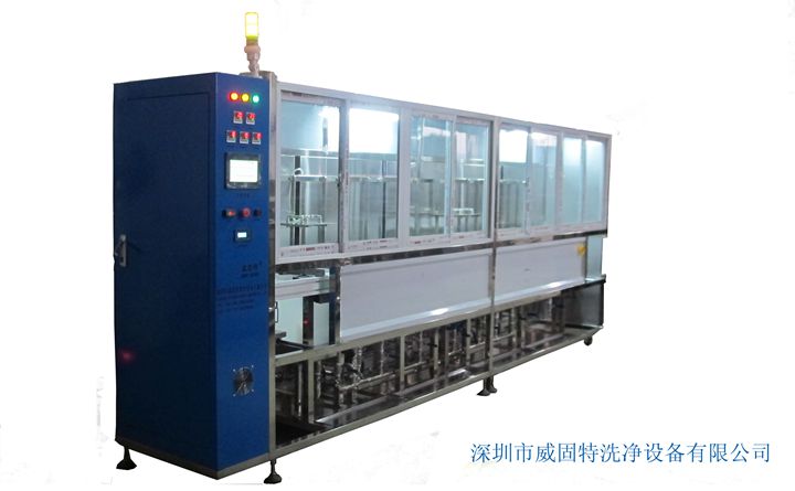 VGT-1409FT為離心甩干式光學(xué)超聲波清洗系統(tǒng),共有14個功能槽,配置有循環(huán)過濾系統(tǒng)、有機溶劑蒸餾回收系統(tǒng)、自動恒溫系統(tǒng)、拋動系統(tǒng)、超聲波清洗系統(tǒng)、抽風(fēng)系統(tǒng)、降噪系統(tǒng)、FFU系統(tǒng)、純水系統(tǒng)、離心甩干系統(tǒng)等。設(shè)備采用環(huán)保型有機溶劑洗滌、水溶劑洗滌、純水漂洗,為環(huán)保型清洗機;