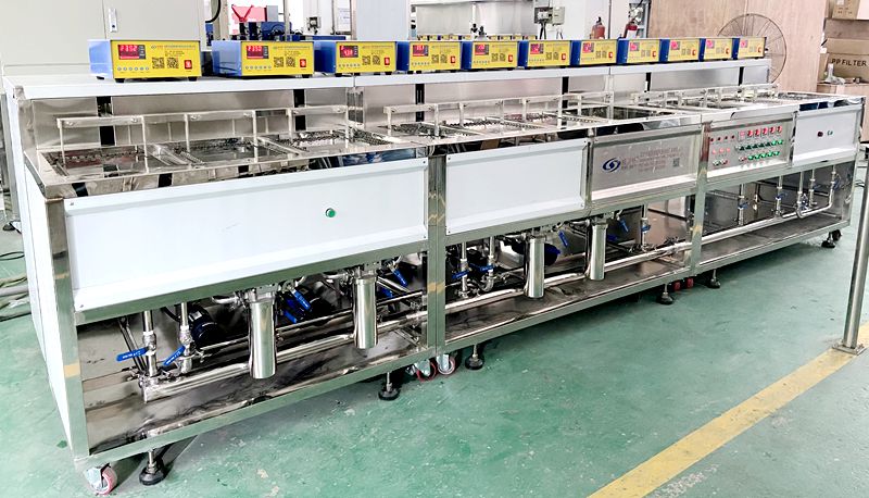 高硼硅玻璃管超聲波清洗機VGT-1307FS 高硼硅玻璃管超聲波清洗機共有13個功能槽,配置有循環過濾系統、自動恒溫系統、拋動系統、超聲波清洗系統、溢流系統等。